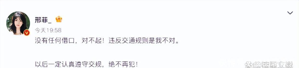 热搜第一又被邢菲“承包”了,这次不是新剧上线,也不是啥营销,而是——她主动出来认错了。事情经过其实挺简单:她自己发文承认 “违反交通规则,完全是我不对,没有任何借口”,态度坦得跟白纸一样,还保证以后一定长记性,绝不会再犯。从语气到内容,都是那种不推锅、不解释、不狡辩的风格,干干净净一句“我错了”,比有些人绕八百个弯子半天说不到重点强太多了。